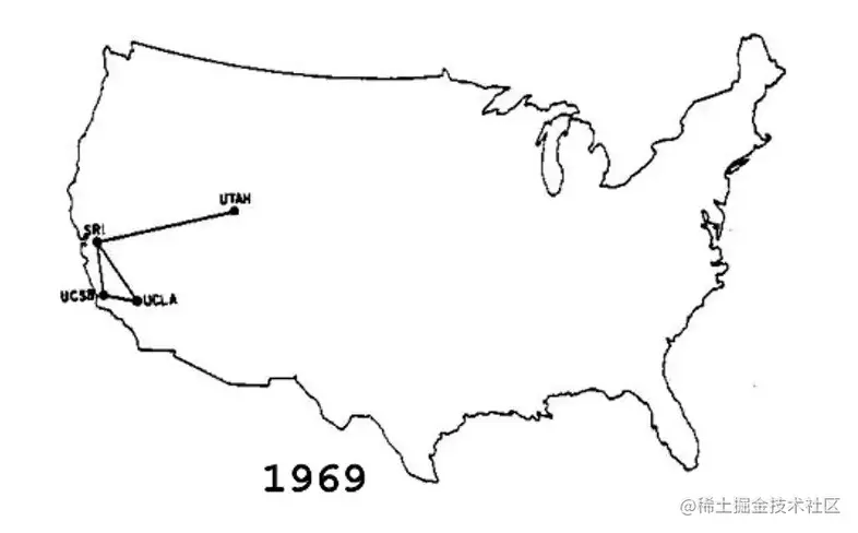(历史趣闻:1969 年 10 月 29 日 UCLA 与斯坦福研究所(SRI)之间成功发出了第一个信号。在网络上发送的第一条消息应该是「Login」,但在发送字母「g」的时候,连接崩溃了。)