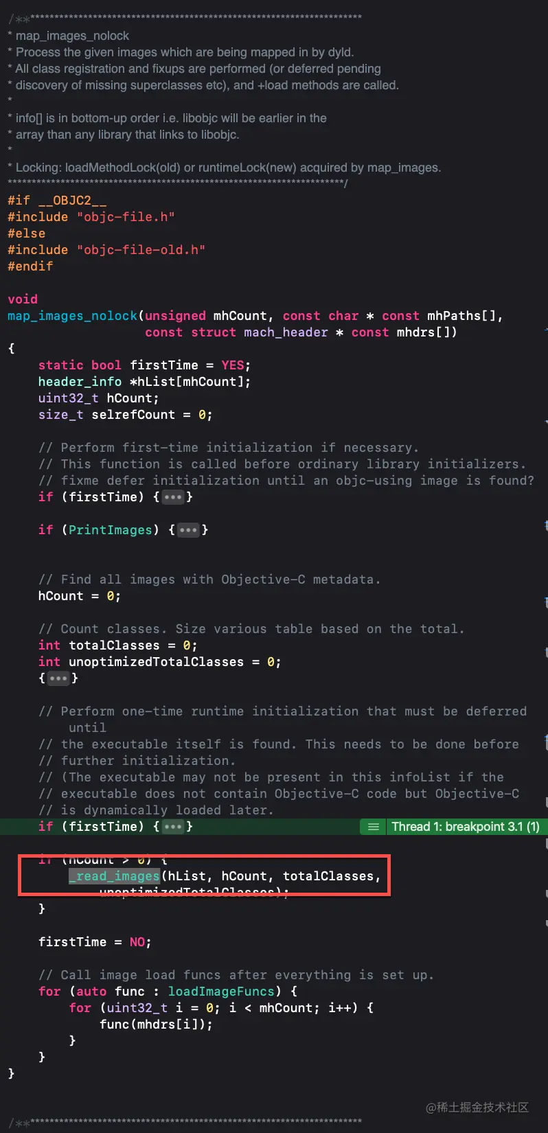 上一个文章中有提到过juejin.cn/post/691944…_objc_init方法中会注册dyld,其中传入了map_images函数load_images函数和unmap_image函数,在分析dyld的加载流程的时候就知道load_images主要是打印所有类的load方法的(这里有个小的优化点就是少写load方法优化加载流程)在探索dyld的注册流程呢,也知道map_images方法肯定是在load_images方法之前调用的(在注册的时候就已经被调用)下面就通过源码探索map_images函数的作用