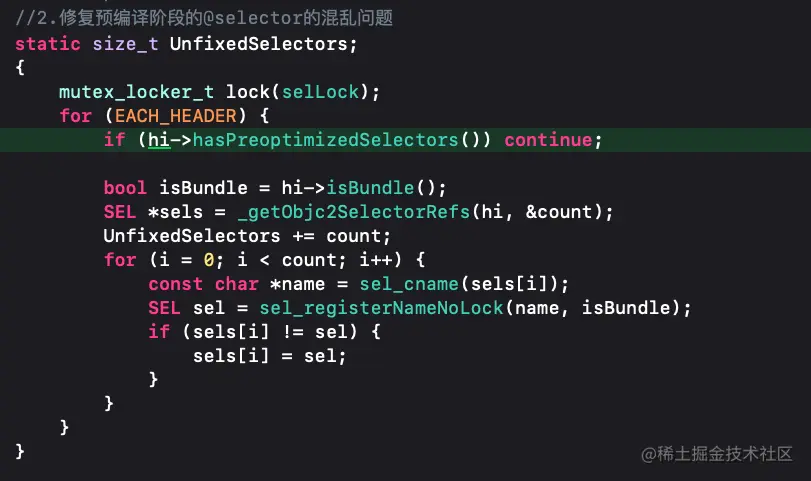 主要作用是创建一个哈希表存储累的信息便于后续快速找到对应的类,gdb_objc_realized_classes存放的是不在共享内存内的并且已经命名的类,哈希表容量是类总是的4/3 - 修复预编译阶段的@selector的混乱问题