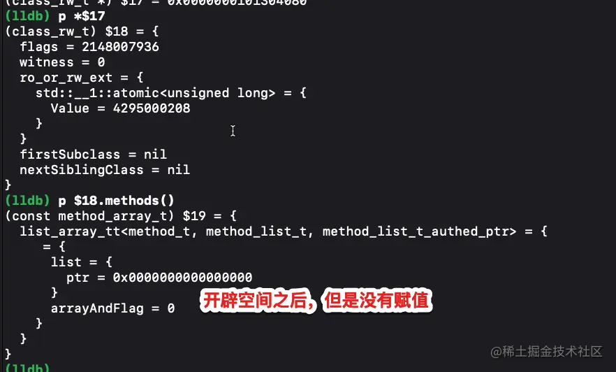 看注释就可以知道该方法的作用是类的首次初始化从源码中可以看到这里给rw申请了空间但是并没有赋值如下打印
