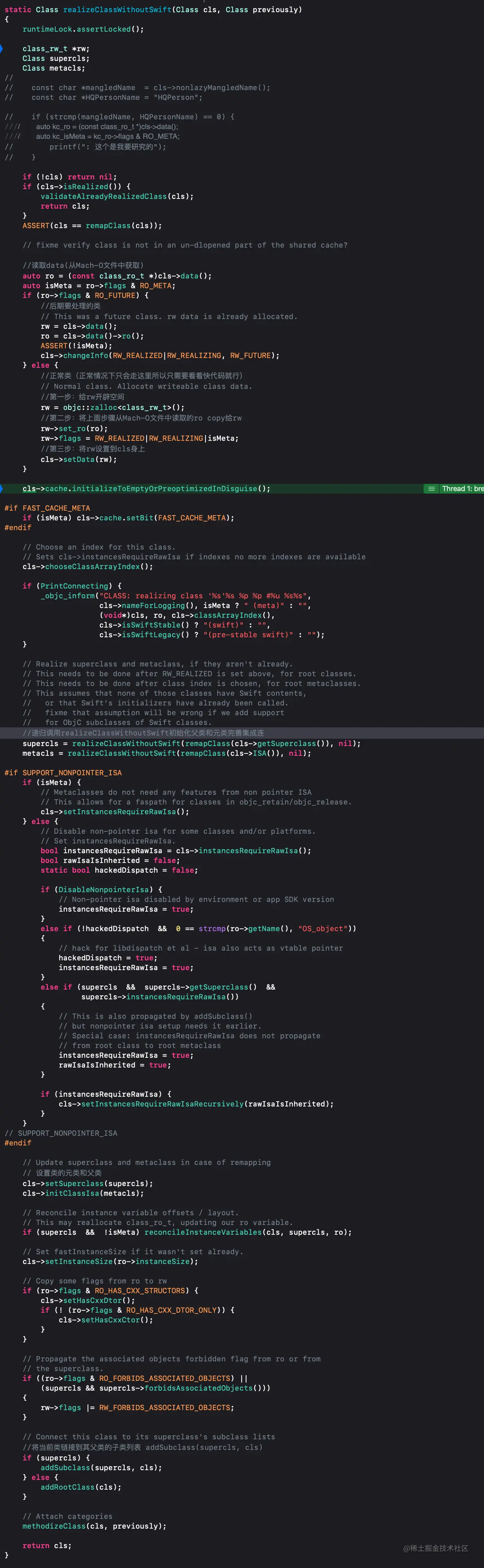 realizeClassWithoutSwift方法再看realizeClassWithoutSwift源码解读 realizeClassWithoutSwift源码分析 看源码之前补充两个知识点:- ro 表示 readOnly,即只读,其在编译时就已经确定了内存,包含类名称、方法、协议和实例变量的信息,由于是只读的,所以属于Clean Memory,而Clean Memory是指加载后不会发生更改的内存