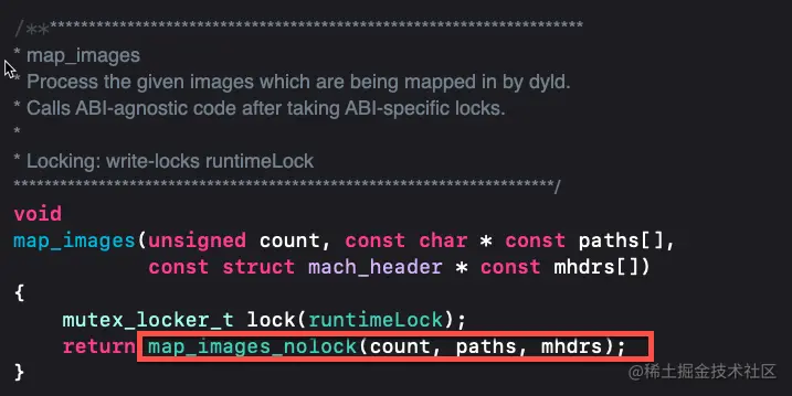 map_image方法源码很简单返回了一个map_images_nolock方法,此时继续向下探索查看map_images_nolock方法map_images_nolock源码分析发现
