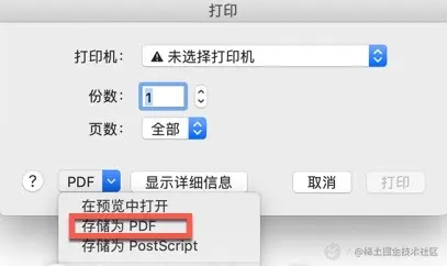 3、接着弹出“打印机选择”,不用选打印机,直接点“PDF”->储存为“PDF”