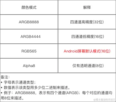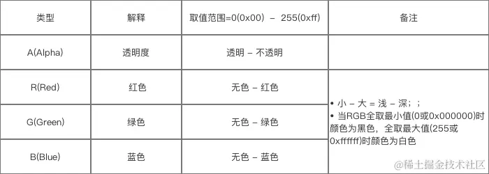 view树的绘制流程是通过ViewRootImpl去负责绘制的,ViewRoot这个类的命名有点坑,最初看到这个名字,翻译过来是view的根节点,但是事实完全不是这样,ViewRoot其实不是View的根节点,它连view节点都算不上,它的主要作用是View树的管理者,负责将DecorView和PhoneWindow“组合”起来,而View树的根节点严格意义上来说只有DecorView;每个DecorView都有一个ViewRoot与之关联,这种关联关系是由WindowManager去进行管理的; 以ARGB8888为例介绍颜色定义: