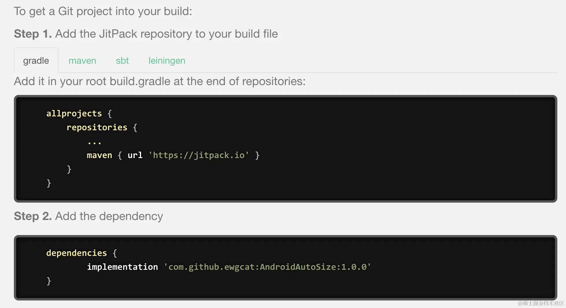 将github的library项目添加到jitpack仓库 静默的小猫 2021-01-30 240 阅读1分钟 打tag命令 git tag 1.0.0 推送到github git push origin 1.0.0 添加到jitpack 先进入jitpack注册帐号,直接用GitHub帐号登录就好,直接在框框的地方粘帖你的项目的名,然后点Look up,再点击Get it,如果Log下面的图片是绿色说明成功了,如果是红色则构建失败,可以点击图标查看详情 使用