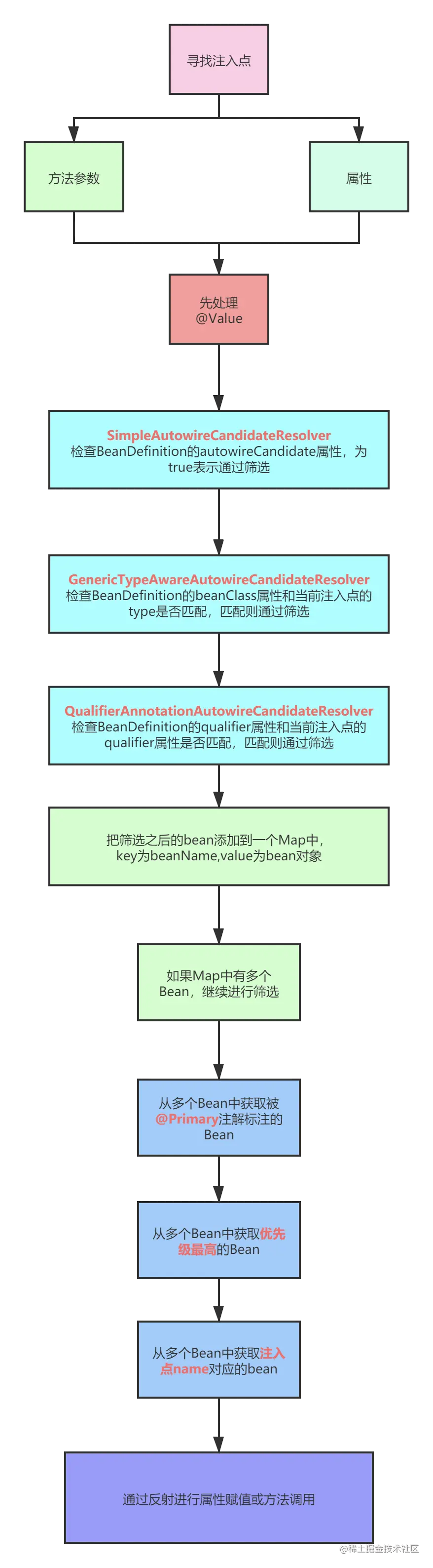 - 进行注入:Spring会利用AutowiredAnnotationBeanPostProcessor的postProcessProperties()方法中,会遍历Set中的注入点开始进行注入。