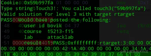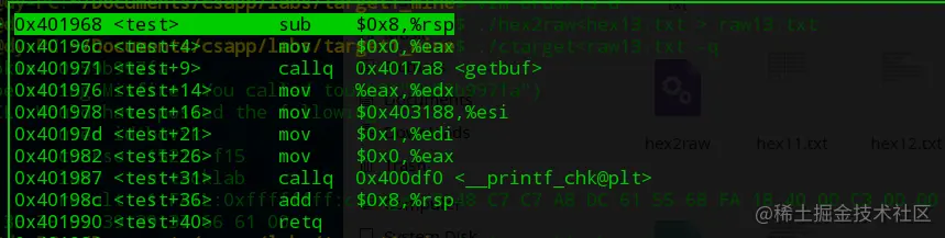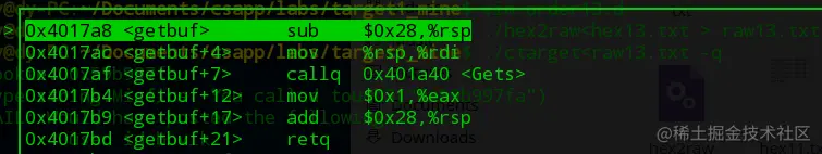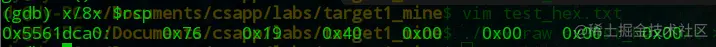 回到终端,输入./hex2raw <test_hex.txt >test_raw.txt 获得对应的字符串, 然后用这个字符串作为ctarget的输入用gdb进行调试(r < test_raw.txt -q, -q 表示不连接服务器)