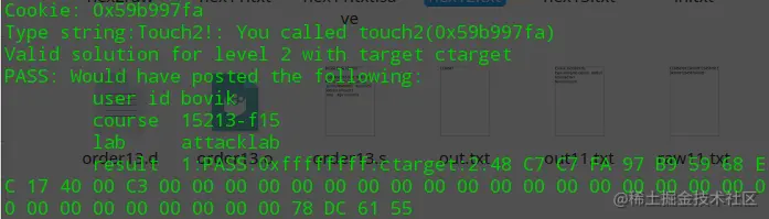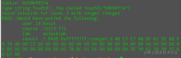 同样是传递参数, 这次要求将自己的cookie对应的字符串传进去(没有0x, 字母小写)。由于缓冲区在之后会被覆盖,我们可以将cookie放在缓冲区之外的部分,因为cookie很短所以不会出现段错误, 注入代码如下: