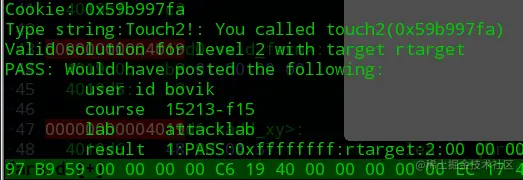 设置参数就是设置%rdi寄存器的值,所以我们有如下想法:在缓冲区中放入操作代码(设置参数后跳转到touch2)用缓冲区溢出让程序跳转到我们的代码。这里最好不要将操作代码放在缓冲区外,因为那个地方是别的程序使用的内存,覆盖的越多越容易出现段错误。