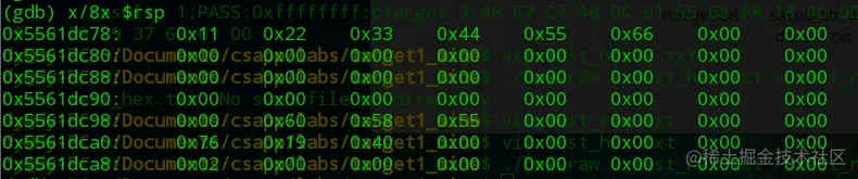 发现储存的确实是返回地址,不过要注意linux是little-endian, 即76 19 40 要被解释成0x401976。发现getbuf第一句是在开辟空间,猜测是用来储存输入字符串的缓冲区,于是在调用Gets完毕后再次查看内存: