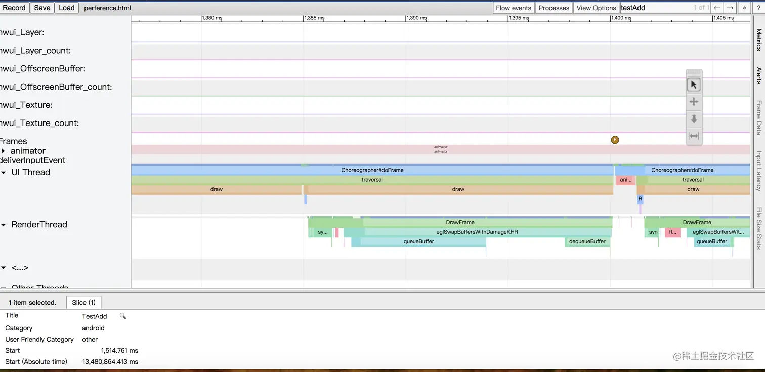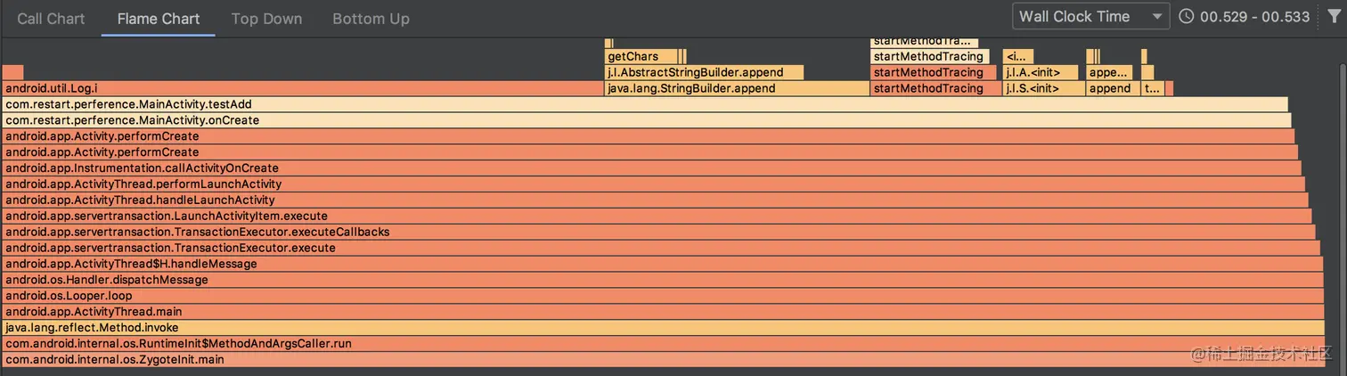 比如图中的testAdd方法,先后调用了Debug.startMethodTracing、Log.i、Debug.stopMethodTracing方法。同时从图中可以看出startMethodTracing方法比stopMethodTracing方法耗时长。在实际优化中,找到哪个方法耗时长,针对性优化是非常有作用的。