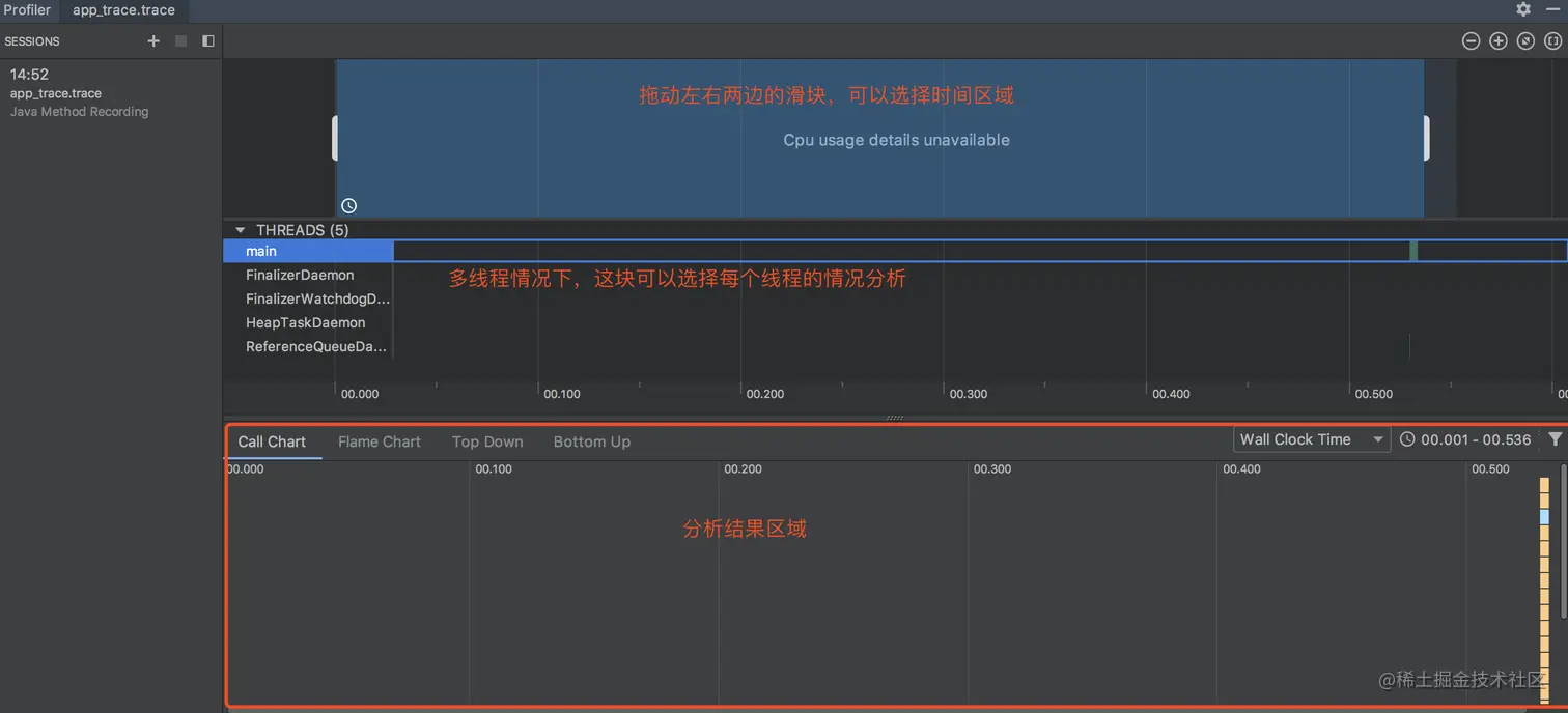 在右上角有个Wall Clock Time和Thread Time的选项,其中Wall Clock Time的意思是方法执行的实际耗时,而Thread Time指的是CPU耗时。我们平时说的优化更多的是优化CPU时间,当有IO操作时,用Thread Time来分析耗时更合理