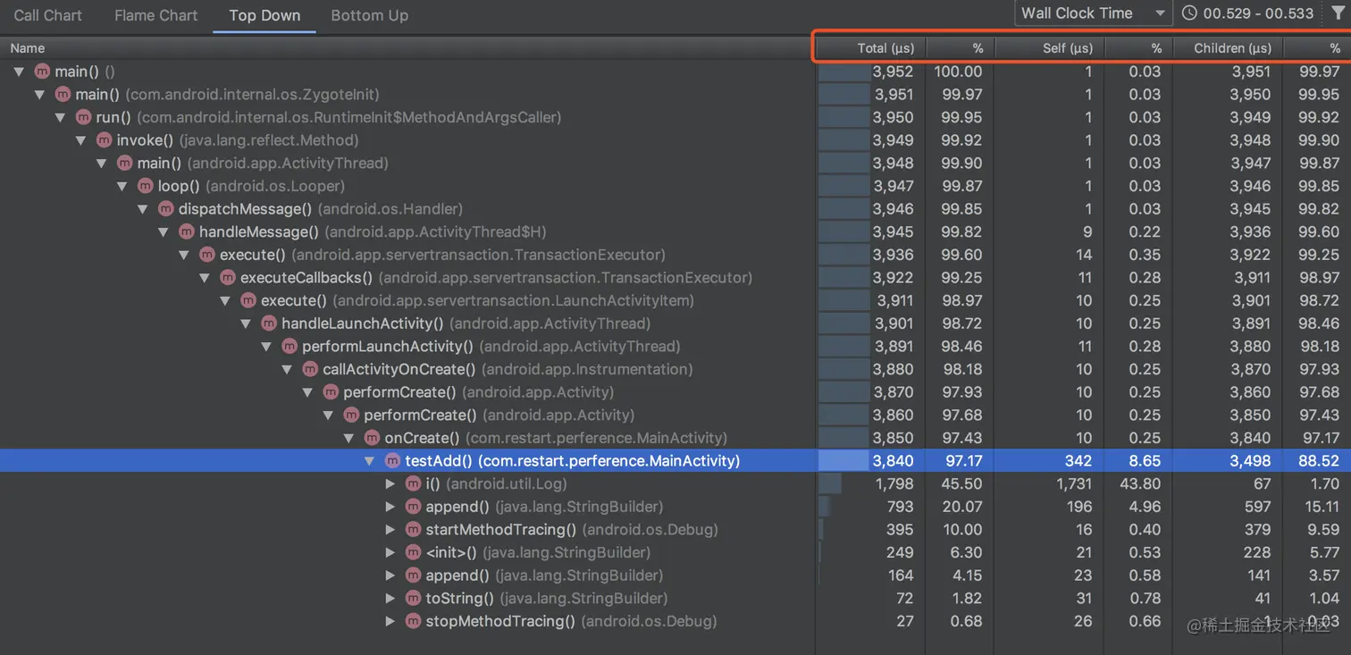 同样以testAdd方法为例,testAdd方法总耗时为3840us,占程序运行时间97%,testAdd方法中自身代码耗时为342us,占比为8.65%,testAdd方法中调用的其他方法总共耗时3498us,占比88.52%