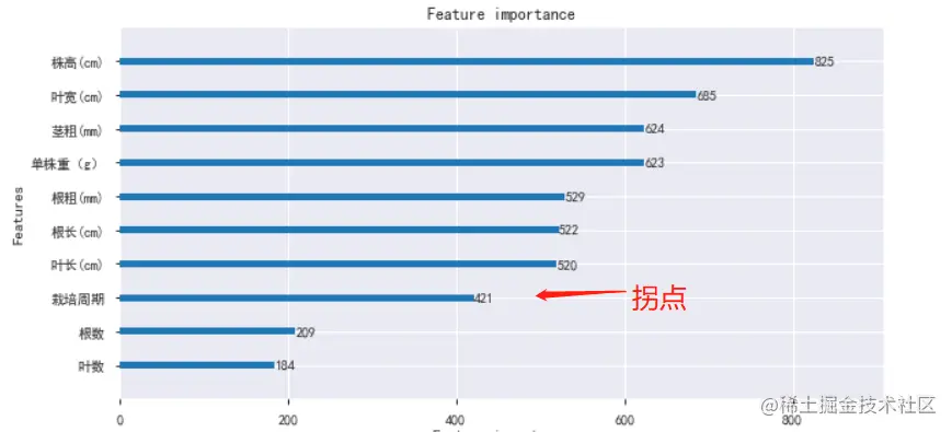 当特征数量多时,对于输出的特征重要性,通常可以按照重要性的拐点划定下阈值选择特征。