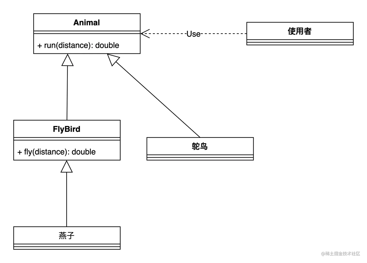 【例】企鹅、鸵鸟和几维鸟从生物学的角度来划分,它们属于鸟类; 但从类的继承关系来看,由于它们不能继承“飞鸟”会飞的功能,所以它们不能定义成“飞鸟”的子类。需要重新它们定义和飞鸟的共同父类,因为它们都会跑, 可以定义成"动物",其类图如下。