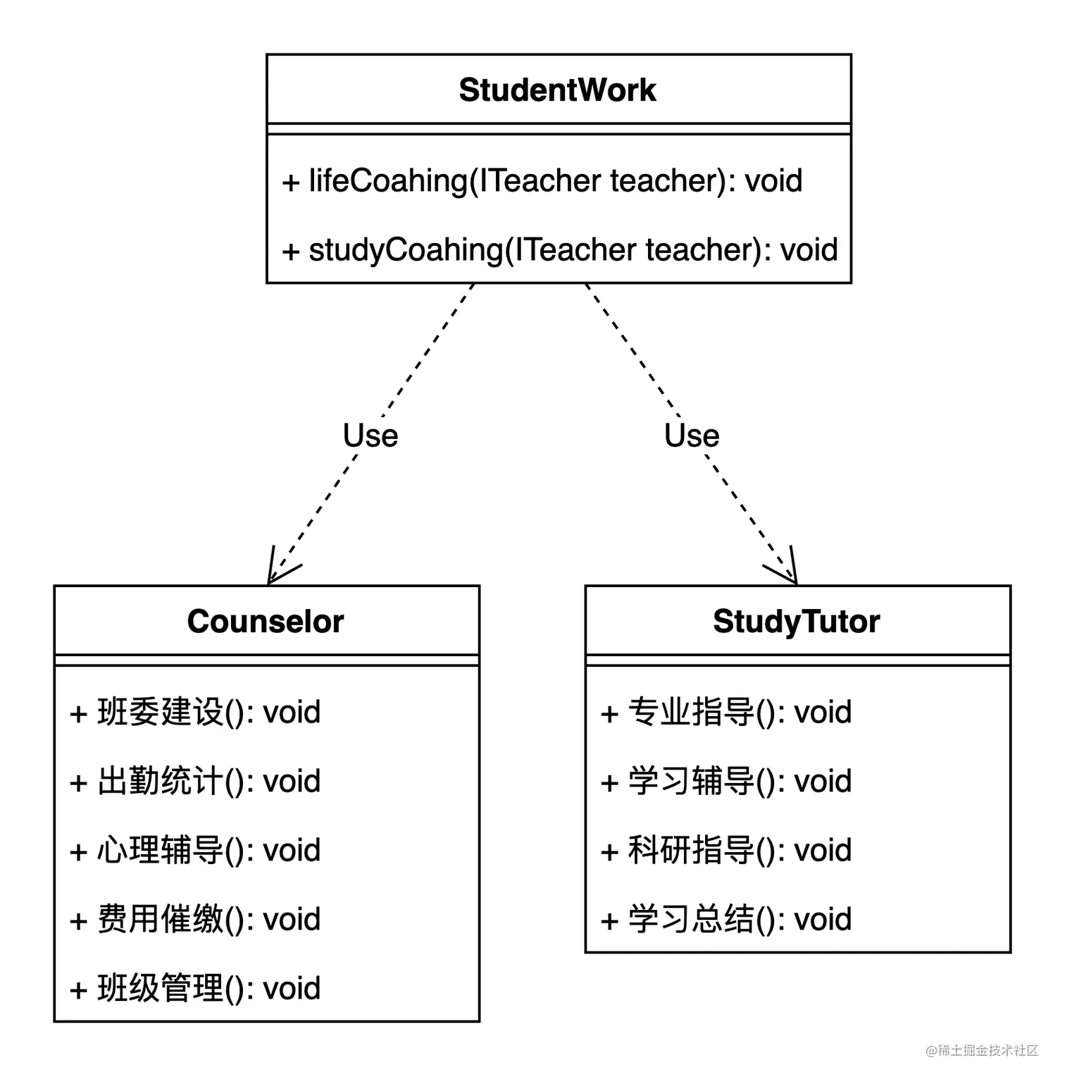 分析:大学学生工作主要包括学生生活辅导和学生学业指导两个方面的工作,其中生活辅导主要包括班委建设、出勤统计、心理辅导、费用催缴、班级管理等工作,学业指导主要包括专业引导、学习辅导、科研指导、学习总结等工作。如果将这些工作交给一位老师负责显然不合理,正确的做 法是生活辅导由辅导员负责,学业指导由学业导师负责,其类图如下。