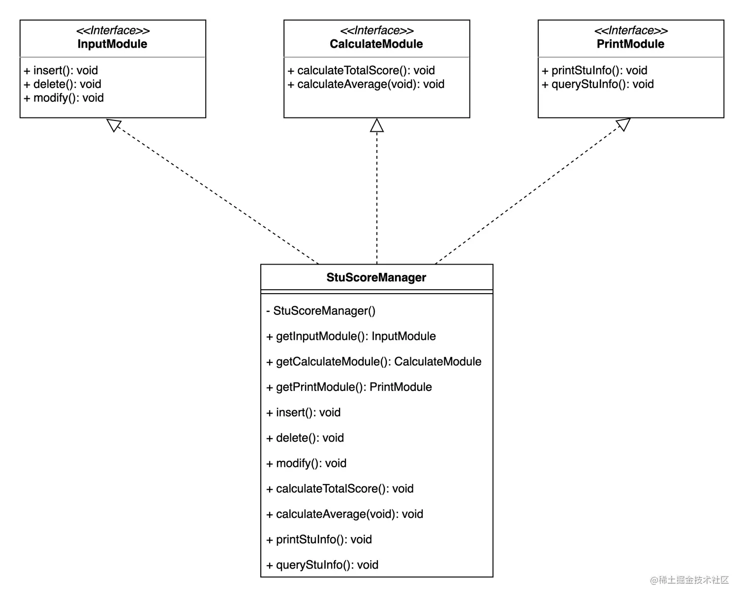 分析:学生成绩管理程序一般包含插入成绩、删除成绩、修改成绩、计算总分、计算均分、打印成绩信息、査询成绩信息等功能,如果将这些功能全部放到一个接口中显然不太合理,正确的做法是将它们分别放在输入模块、统计模块和打印模块等 3 个模块中,其类图如下。
