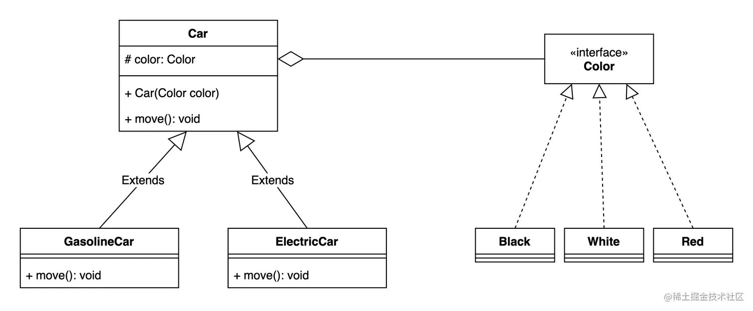 分析:汽车按“动力源”划分可分为汽油汽车、电动汽车等;按“颜色”划分可分为白色汽车、黑色汽车和红色汽车等。如果同时考虑这两种分类,其组合就很多。用继承关系实现会产生很多子类,而且增加新的“动力源”或者增加新的“颜色”都要修改源代码,这违背了开闭原则,显然不可取。但如果改用组合关系实现就能很好地解决以上问题,其类图如下。