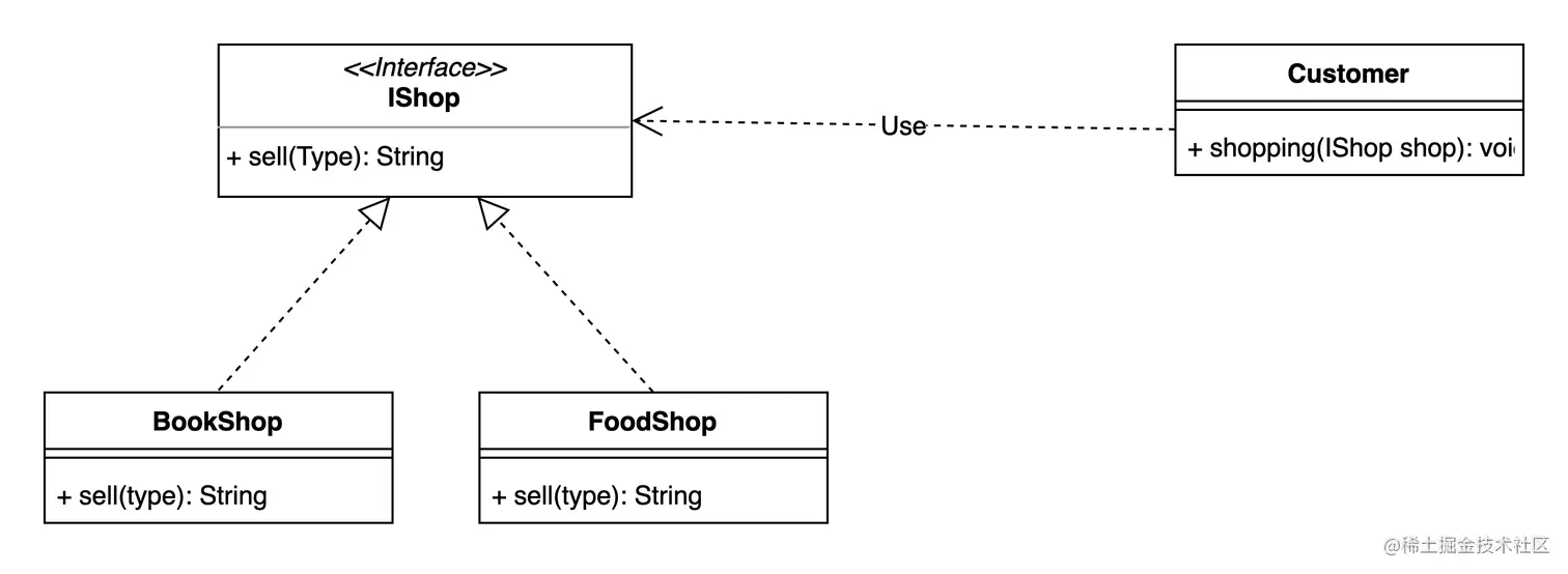 顾客每更换一家商店,都要修改一次代码,这明显违背了开闭原则。 存在以上缺点的原因是:顾客类设计时同具体的商店类绑定了,这违背了依赖倒置原则。 解决方法是:定义“BookShop”和“FoodShop”的共同接口 Shop,顾客类面向该接口编程,其类图如下。