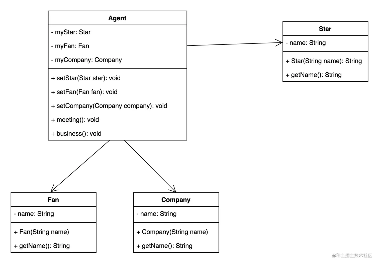 分析:明星由于全身心投入艺术,所以许多日常事务由经纪人负责处理,如与粉丝的见面会,与媒体公司的业务洽淡等。这里的经纪人是明星的朋友,而粉丝和媒体公司是陌生人,所以适合使用迪米特法则,其类图如下。