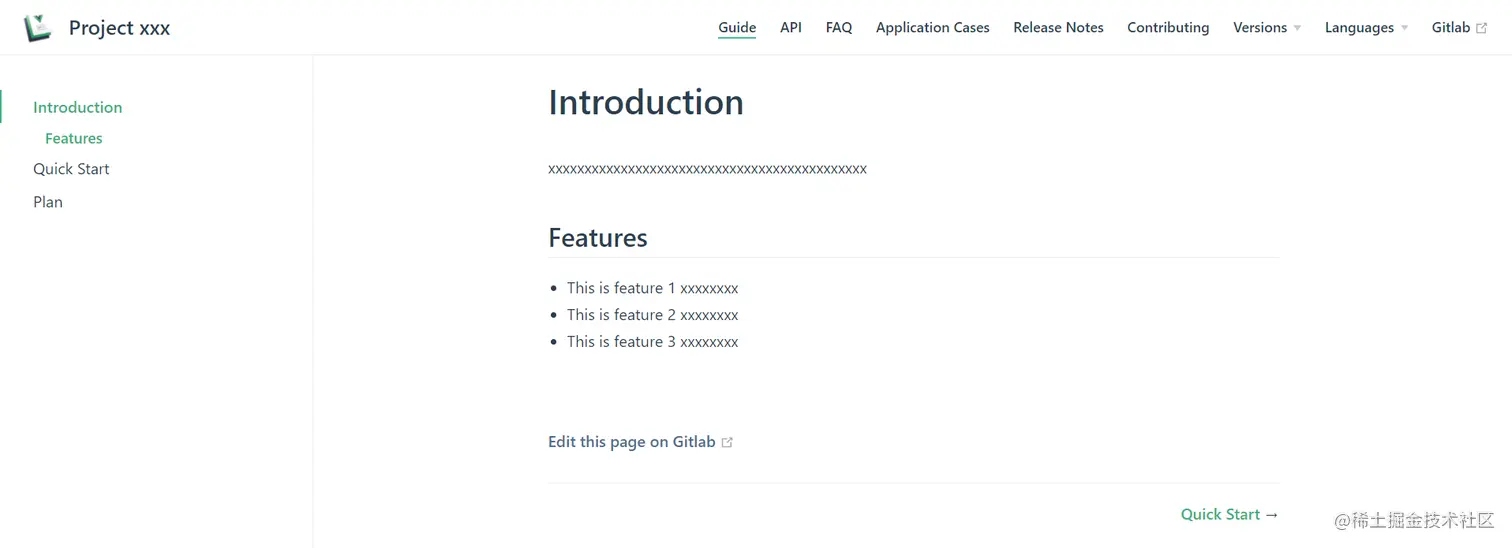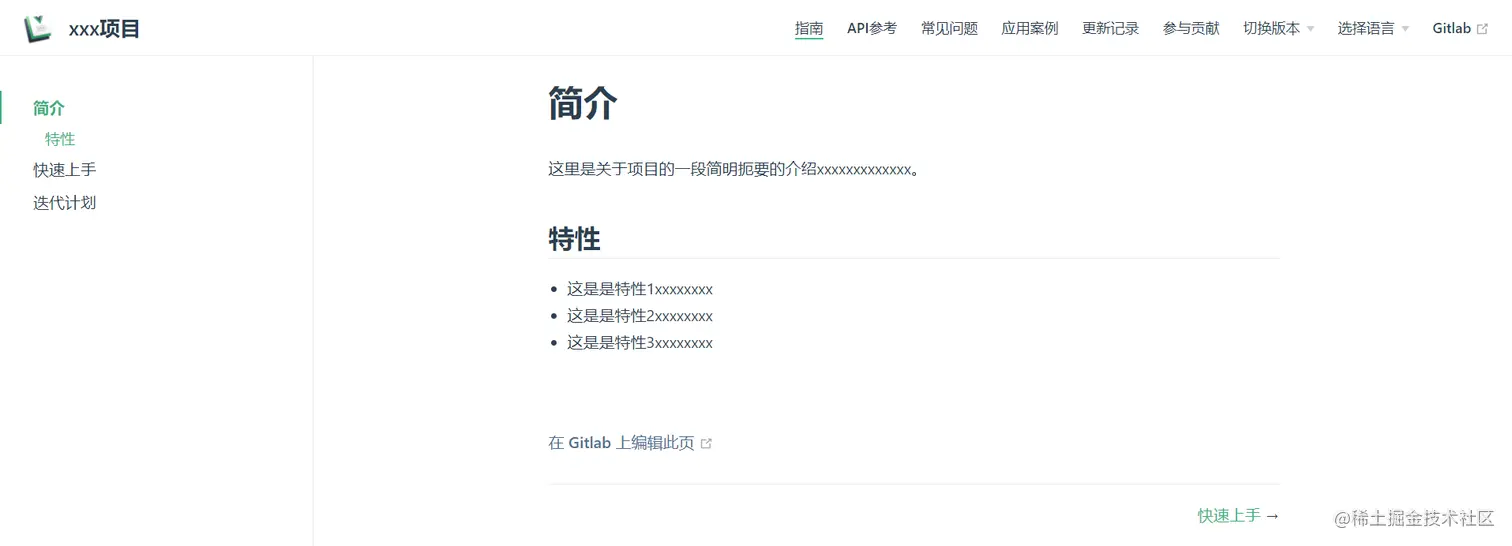 此时执行`npm run docs:dev'即可预览到效果,如下图所示,可以提供出中文和英文模板,把其中的xxx改成项目的内容,就得到了一份美观且结构严谨的文档。效率瞬间提高好几倍,而且风格也很一致!