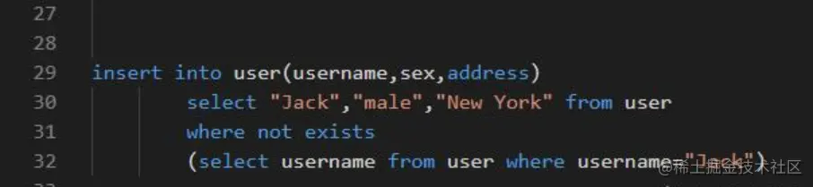 即insert into … select … where not exist ... ,这种方式适合于插入的数据字段没有设置主键或唯一索引,当插入一条数据时,首先判断MySQL数据库中是否存在这条数据,如果不存在,则正常插入,如果存在,则忽略: