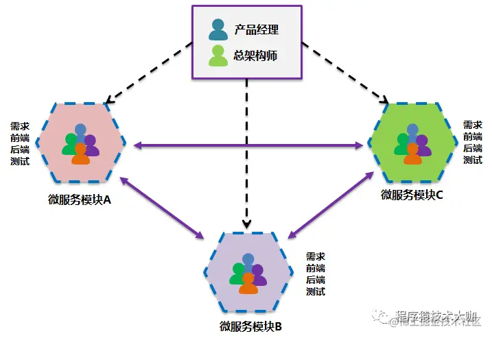 即产品规划和架构师很类似微服务架构里面的注册控制中心的职责。这也是我们常说的技术上的微服务拆分,实际上真正先行的业务组织团队的架构调整和职责拆分。