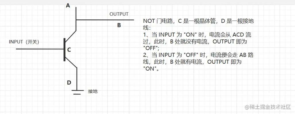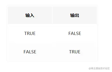 NOT:NOT 运算有一个输入,一个输出,输入为 true 时,输出 false;输入为 false 时,输出为 true。我们可以列出其“真值表”以及画出其电路实现。