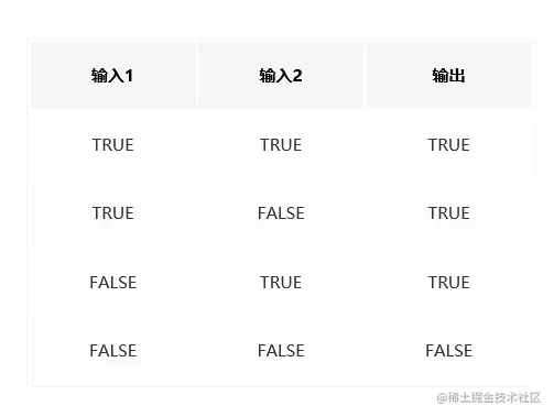 OR:OR 运算也有两个输入,当两个输入有其中一个为 true 时,输出便为 true;否则,输出则为 false。