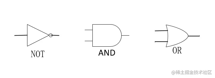 接着,我们可以进行一次抽象。可以将 NOT 门电路、AND 门电路、OR 门电路抽象成如下符号,电路本身的晶体管和电线还是在的,只是换了一种表现方式: