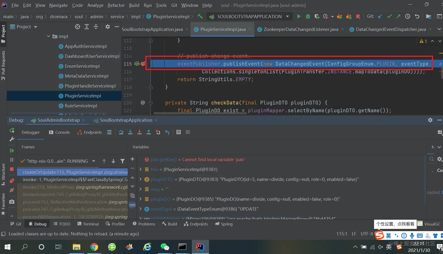 2、soul-admin后台操作更改divide插件规则,首先soul-admin会发布事件,并监听事件同步更新数据至zookeeper: