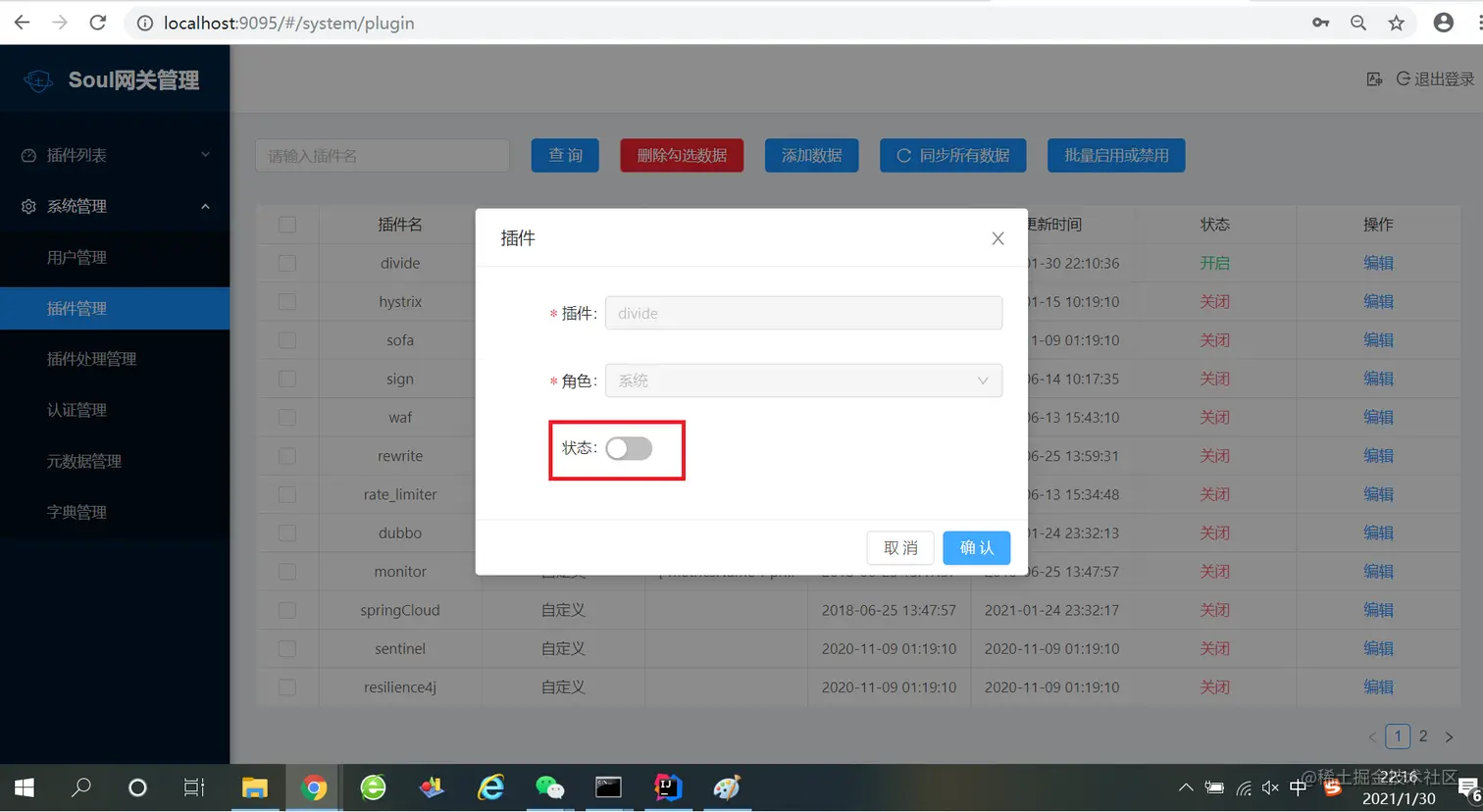 1、在网关后台尝试更改divide插件状态,debug跟踪,如下: