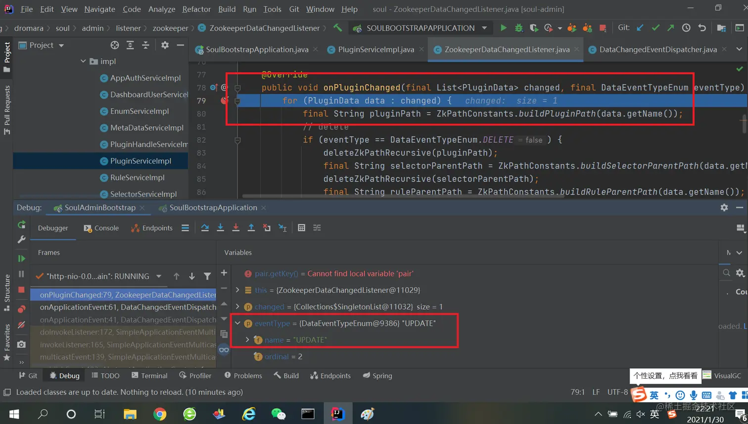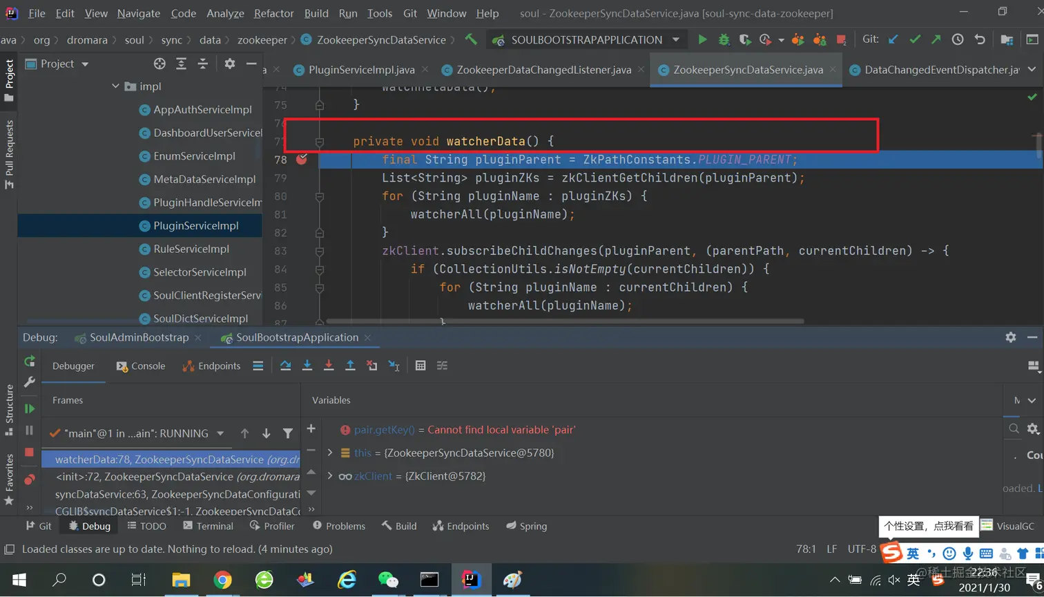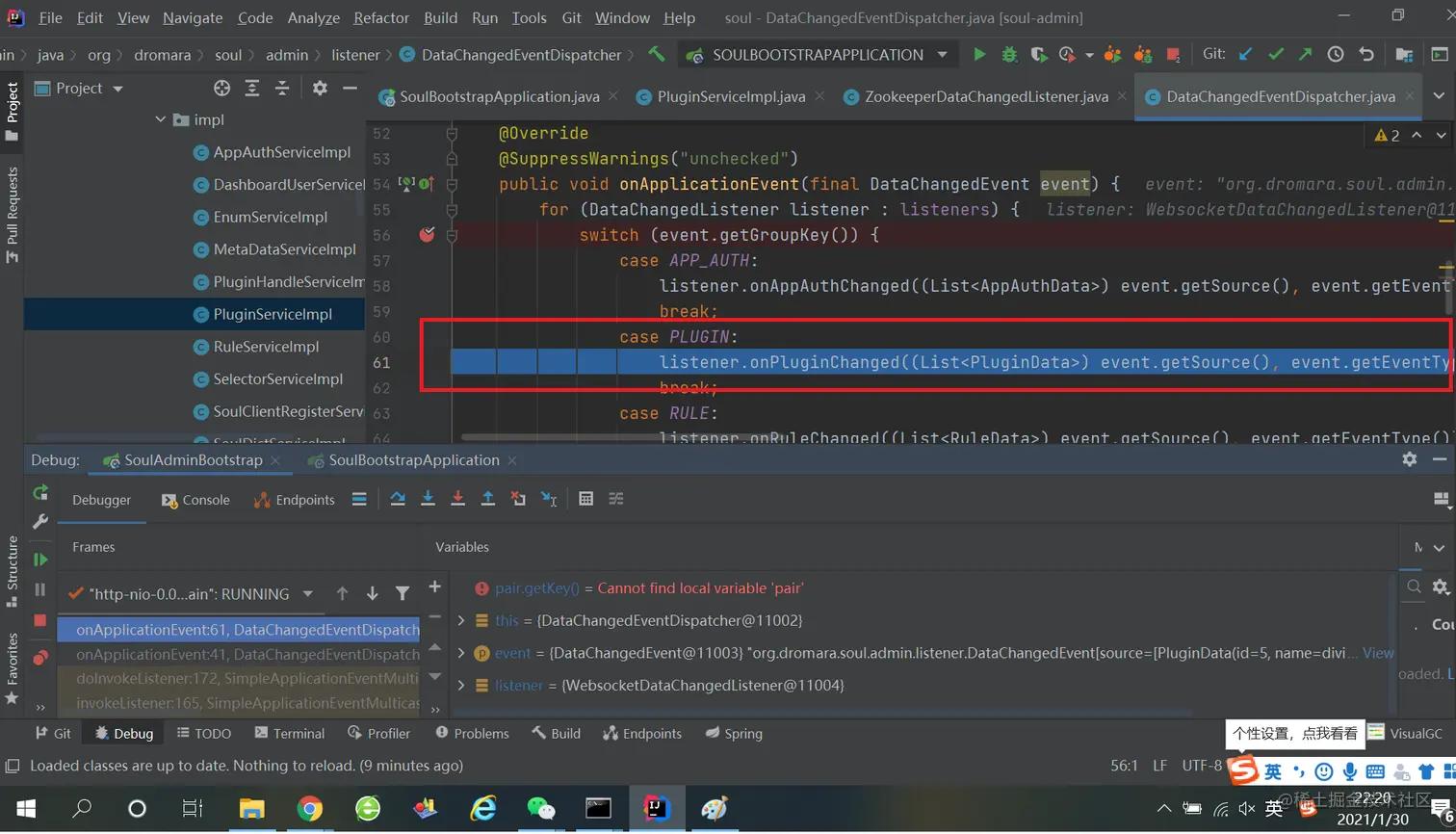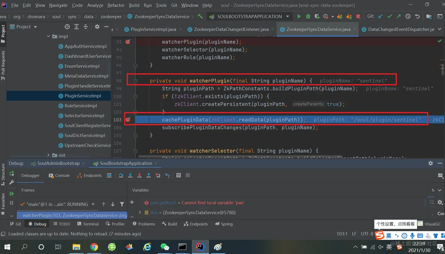 三、soul-bootstrap 是如何感知网关数据变化的 1、ZookeeperSyncDataService类的cacheRuleData方法上打上断点,更新插件规则,观察是否会进入此断点: