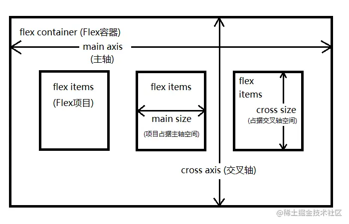 Flex 布局有一个隐式的坐标空间,水平方向有一条主轴(main-axis),垂直方向上有一条交叉轴(cross-axis):