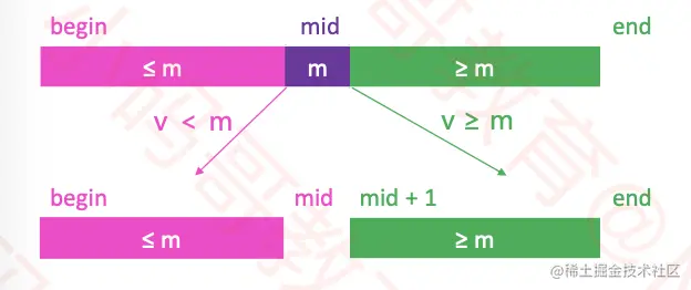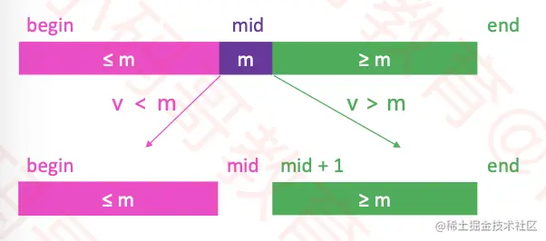 - 如果 v >= m, 去[mid + 1,end)范围内二分搜索