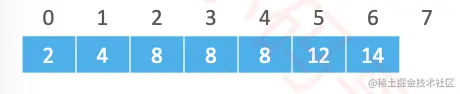 - mid = (0 + 7)/ 2 = 3,取出8和10比较,8小于10所以取右边