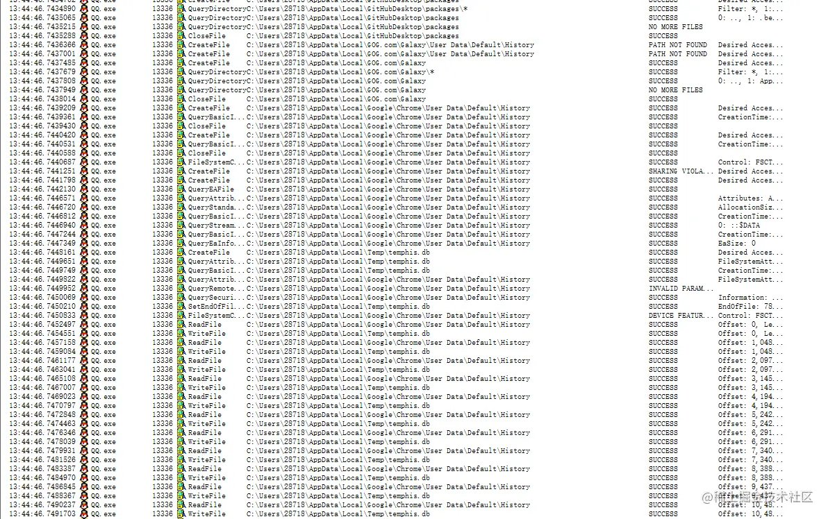 这一段的逻辑还是很好看懂的,先读取各种 User Data\Default\History 文件,读到了就复制到Temp目录下的temphis.db。回去看下Procmom,果然没错。