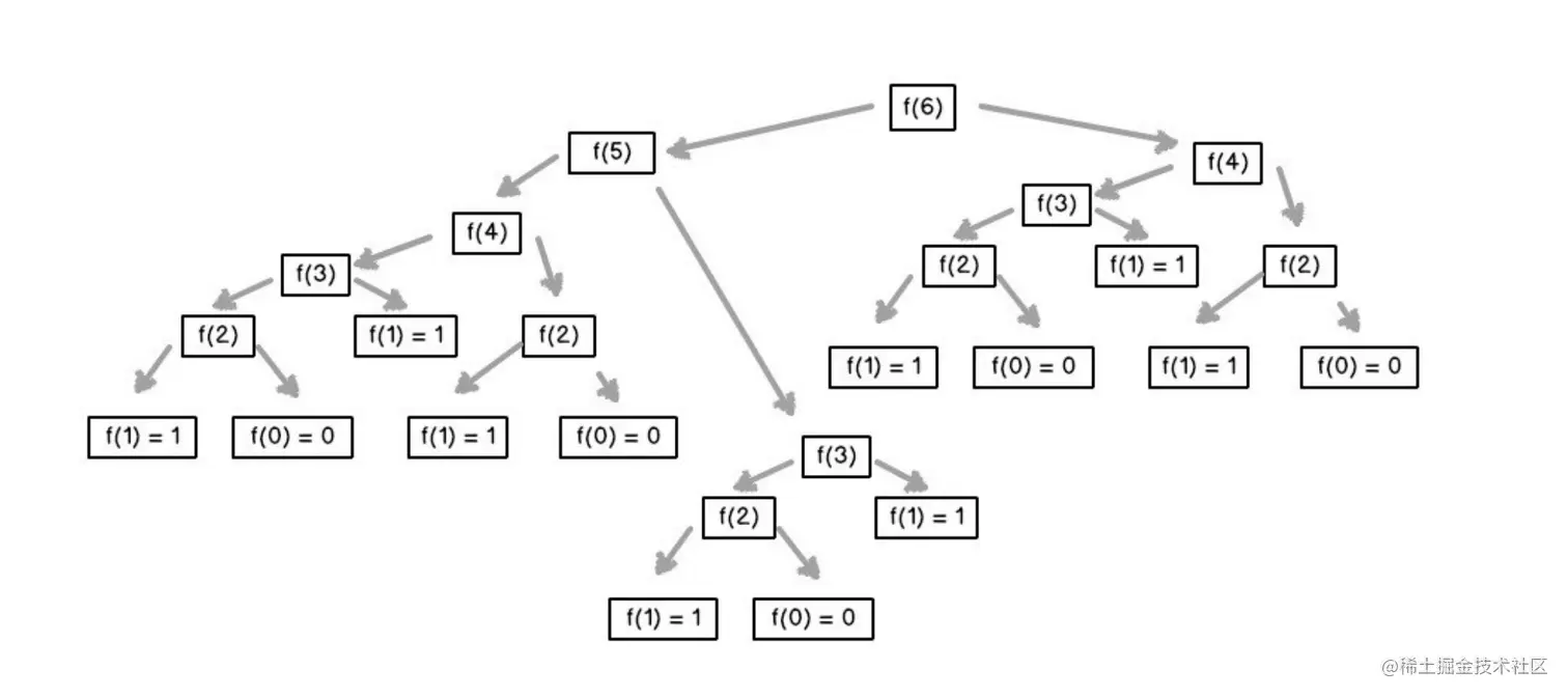 F(n) = F(n-1) + F(n-2), 时间复杂度为 O(2^n), 左右两边会重复计算