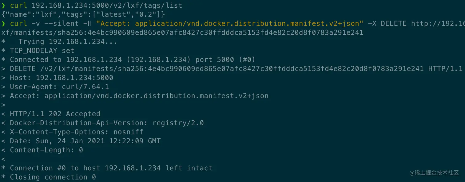 curl -v --silent -H "Accept: application/vnd.docker.distribution.manifest.v2+json" -X DELETE http://192.168.1.234:5000/v2/lxf/manifests/sha256:4e4bc990609ed865e07afc8427c30ffdddca5153fd4e82c20d8f0783a291e241