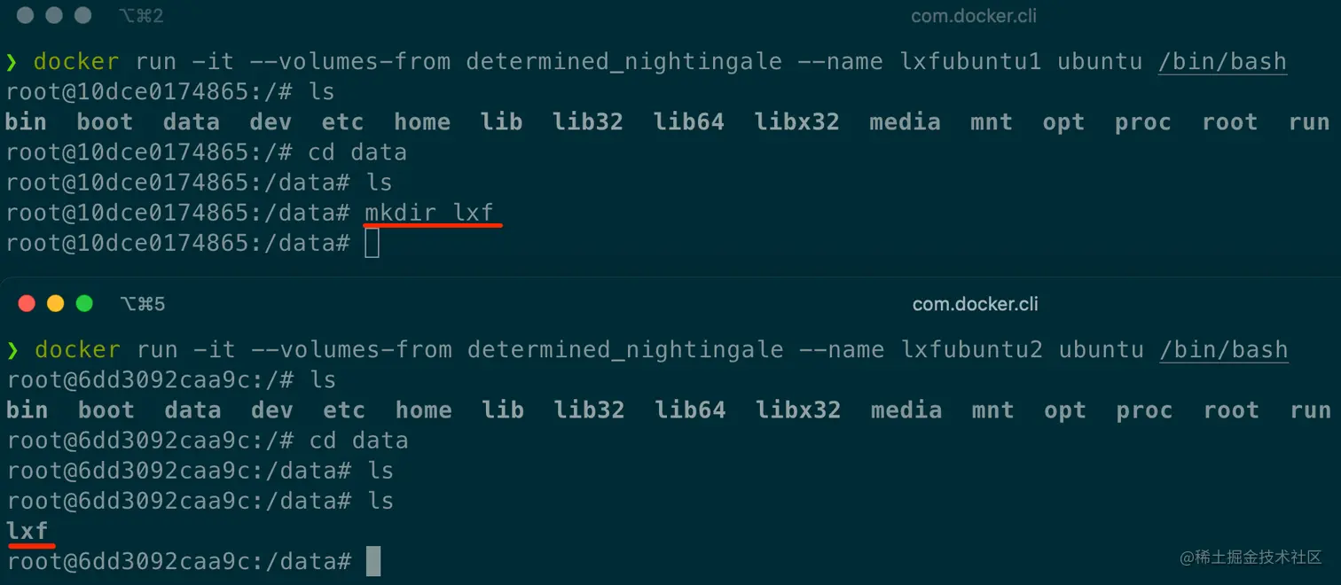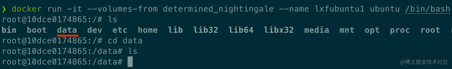 docker run -it -v ~/lxf/data:/data --volumes-from determined_nightingale --name lxfubuntu3 ubuntu /bin/bash