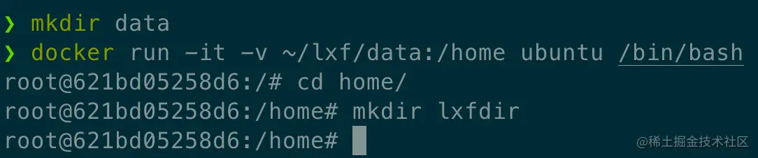 docker run -it -v ~/lxf/data:/home ubuntu /bin/bash
