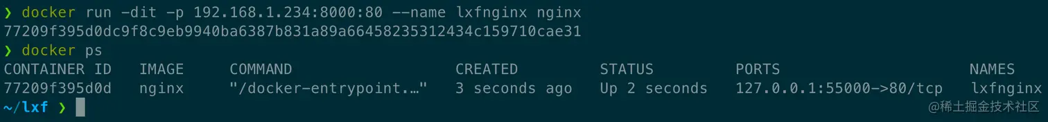 docker run -dit -p 192.168.1.234:8000:80 --name lxfnginx nginx