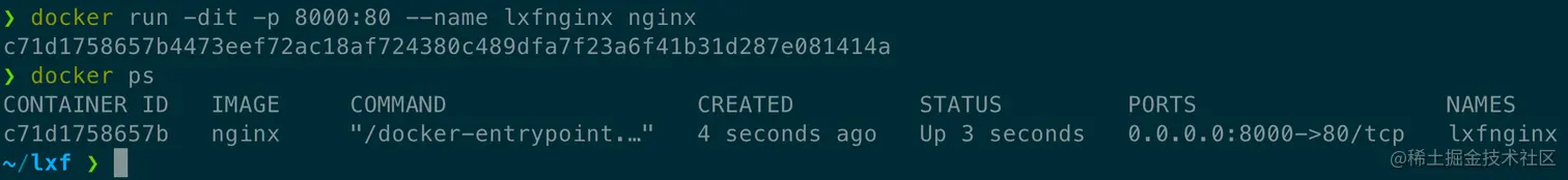 docker run -dit -p 8000:80 --name lxfnginx nginx