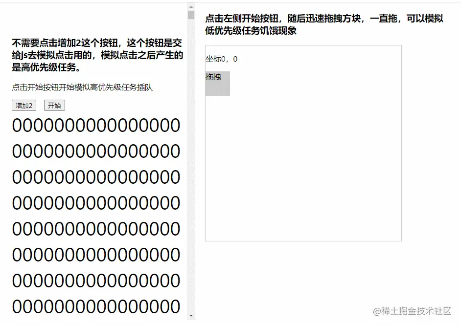饥饿问题说到底就是高优先级任务不能毫无底线地打断低优先级任务,一旦低优先级任务过期了,那么他就会被提升到同步优先级去立即执行。如下面的例子: 我点击左面的开始按钮,开始渲染大量DOM节点,完成一次正常的高优先级插队任务: