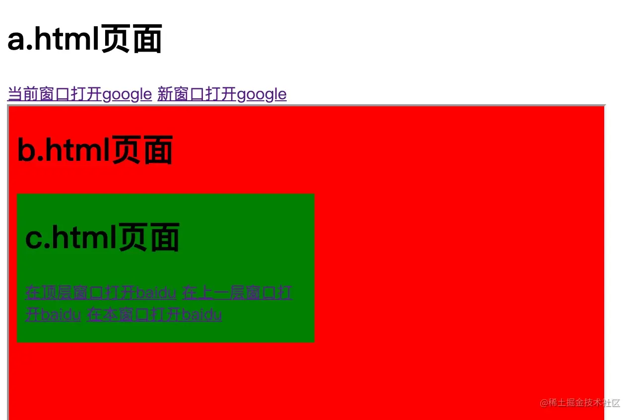 以上代码效果如下图(对于c.html页面来说,a.html页面为顶层窗口,b.html页面为父级窗口,c.html页面为本窗口)