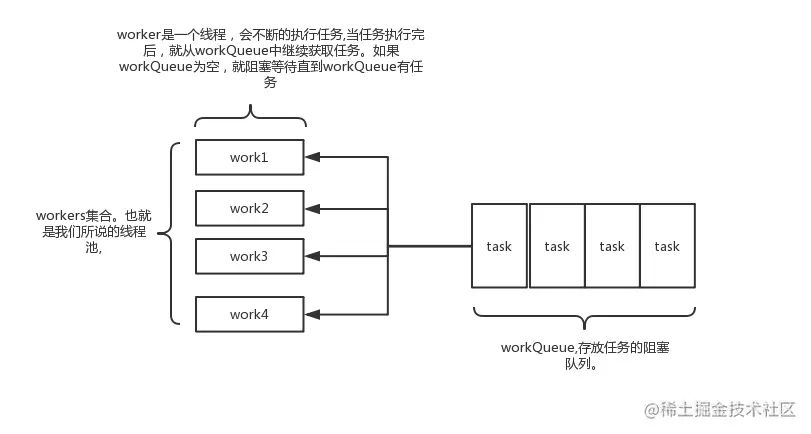 java 线程池的实现原理其实很简单,就是一个线程集合 workerSet 和阻塞队列 workQueue。当向线程池提交一个任务的时候,线程池会将任务先放到 workQueue 中,workerSet 中的线程会不断的从 workQueue 中获取线程然后执行。当 workQueue 中没有任务的时候,worker 就会阻塞,直到队列中有任务了就取出来继续执行