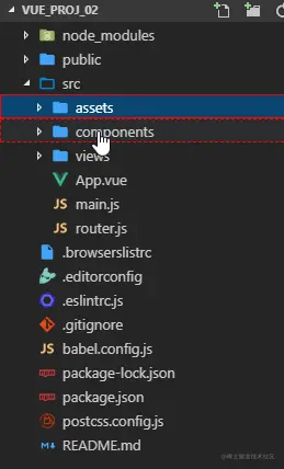 node_modules:依赖包目录 public:静态资源目录 src:源码目录 src/assets:资源目录 src/components:组件目录 src/router.js:路由js src/views:视图组件目录 src/App.vue:根组件 src/main.js:入口js babel.config.js:babel配置文件 -