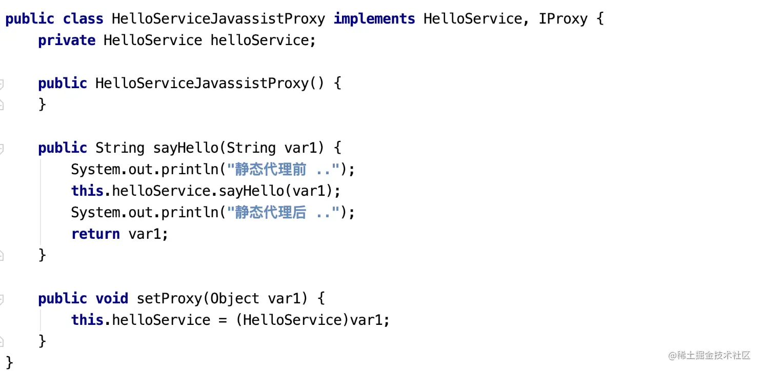 通过调用setProxy设置实现类,然后调用目标方法sayHello。获取到对象后可以分别转换为这两个接口进行方法调用。可能有的朋友会问,为什么void setProxy(Object t)不使用泛型。原因是对其支持不是很好,设置起来有点麻烦,所以就没设置。看一下具体的实现: