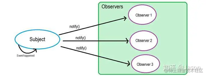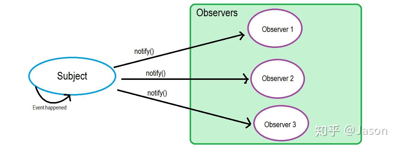 举个例子,当数据有更新,如 changed() 方法被调用,用来更新 state 数据,比如温度、气压等等。这样写的问题是,如果想更新更多的信息,比如说湿度,那就要去修改 changed() 方法的代码,这就是紧耦合的坏处。对于观察者模式,我们仅仅维护一个可观察者对象即可,即一个 Observable 实例,当有数据变更时,它只需维护一套观察者(Observer)的集合,这些 Observer 实现相同的接口,Subject 只需要知道,通知 Observer 时,需要调用哪个统一方法就好了。如下图: