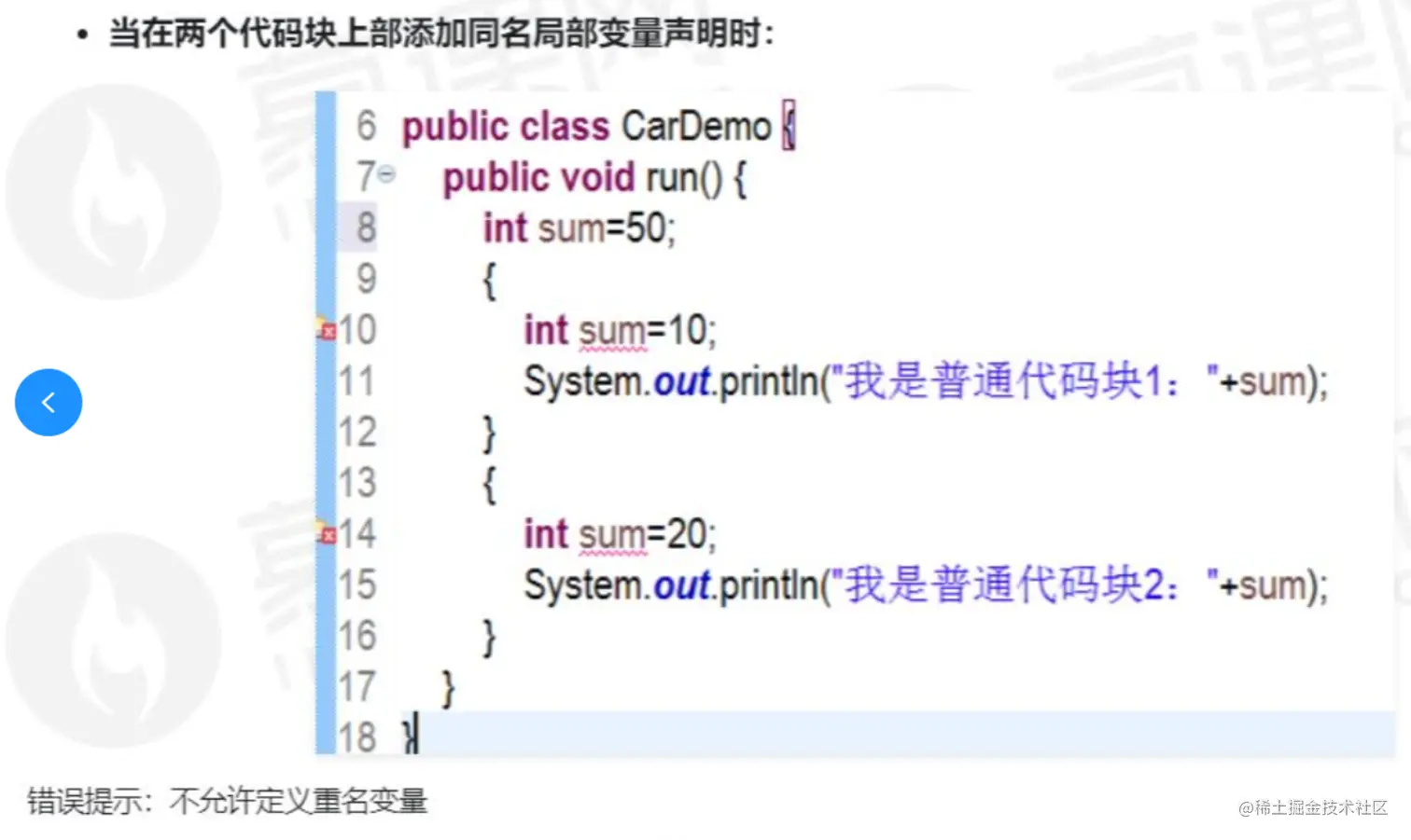 方法内定义的局部变量,作用范围为:自定义位置起,至方法结束。在此期间,不允许方法中普通代码块内存在局部变量的声明